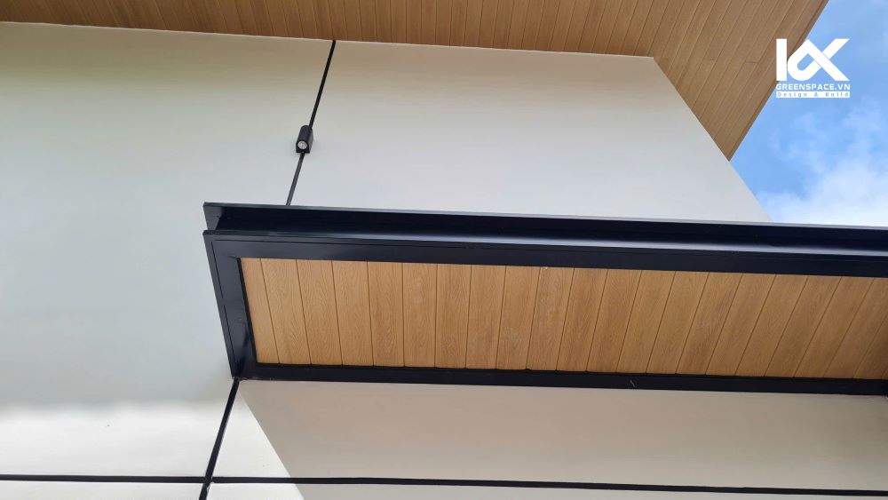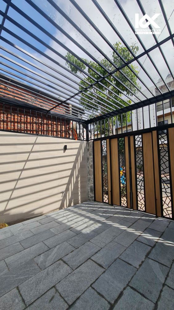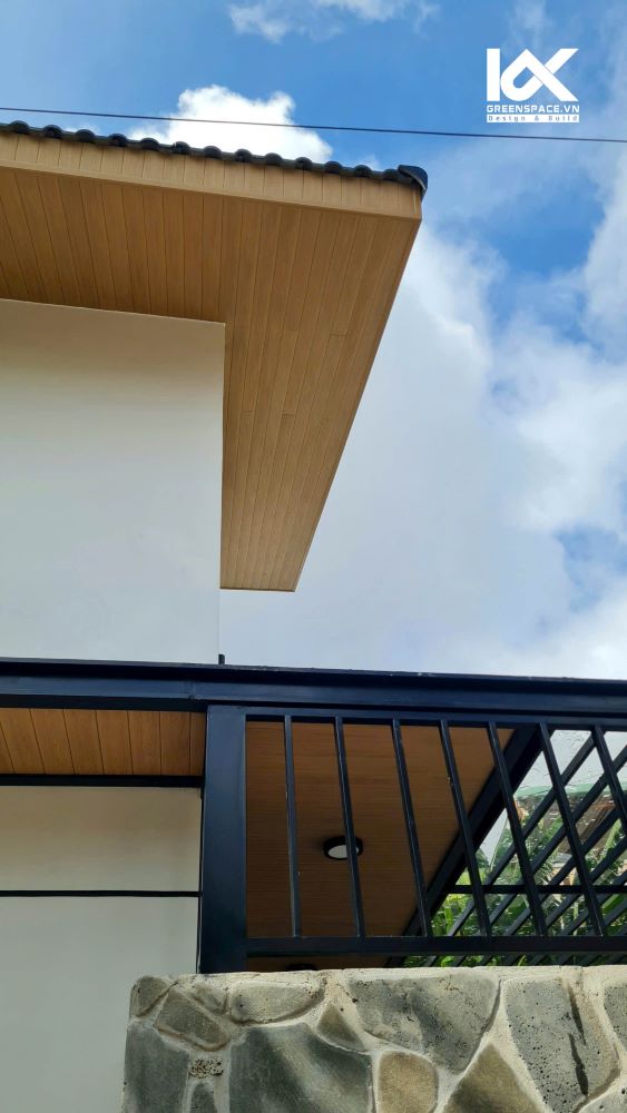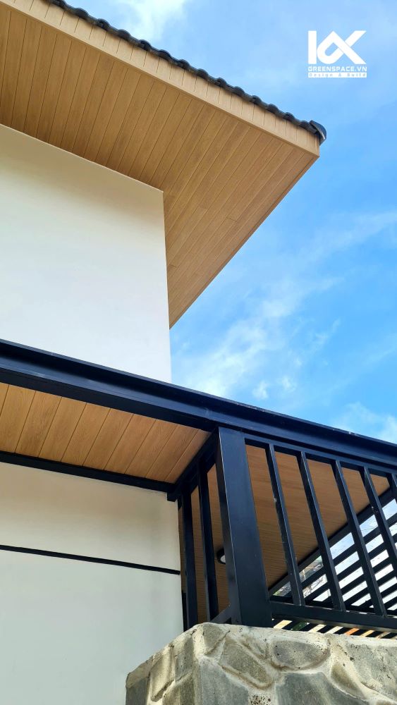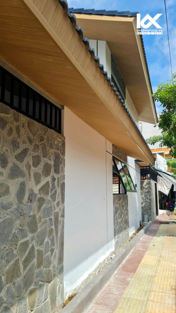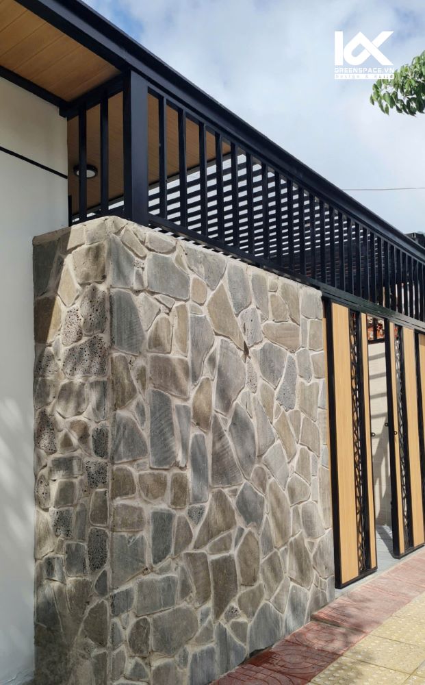 Ngoại thất ngôi nhà được hoàn thiện tinh tế với mái Nhật thanh thoát. Tường ốp đá tạo điểm nhấn sang trọng. Hàng rào sắt thiết kế chắc chắn và hiện đại. Sân lát gạch chống trơn bền bỉ theo thời gian. Cổng gỗ kết hợp kim loại tăng vẻ ấm áp và an toàn. Không gian ngoài trời thoáng đãng, gần gũi thiên nhiên.