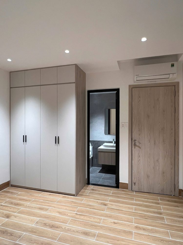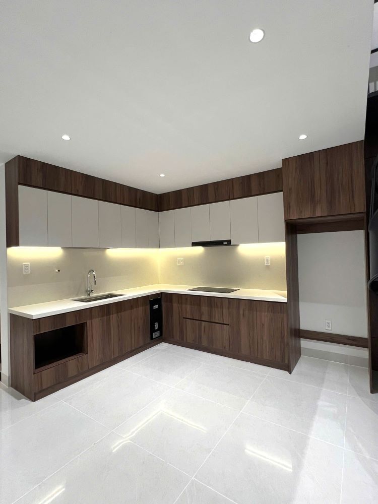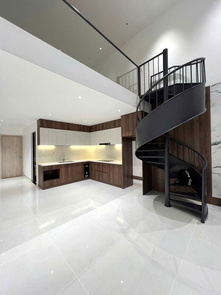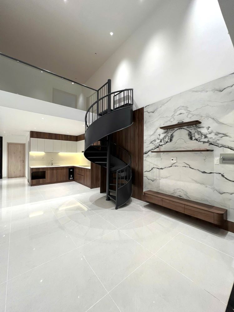 Nội thất được bố trí gọn gàng và tinh tế. Tông màu sáng kết hợp gỗ tạo sự ấm cúng. Phòng khách rộng rãi với trần cao thoáng đãng. Bếp hiện đại với hệ tủ gỗ tiện nghi. Không gian mang lại sự tối giản nhưng sang trọng.