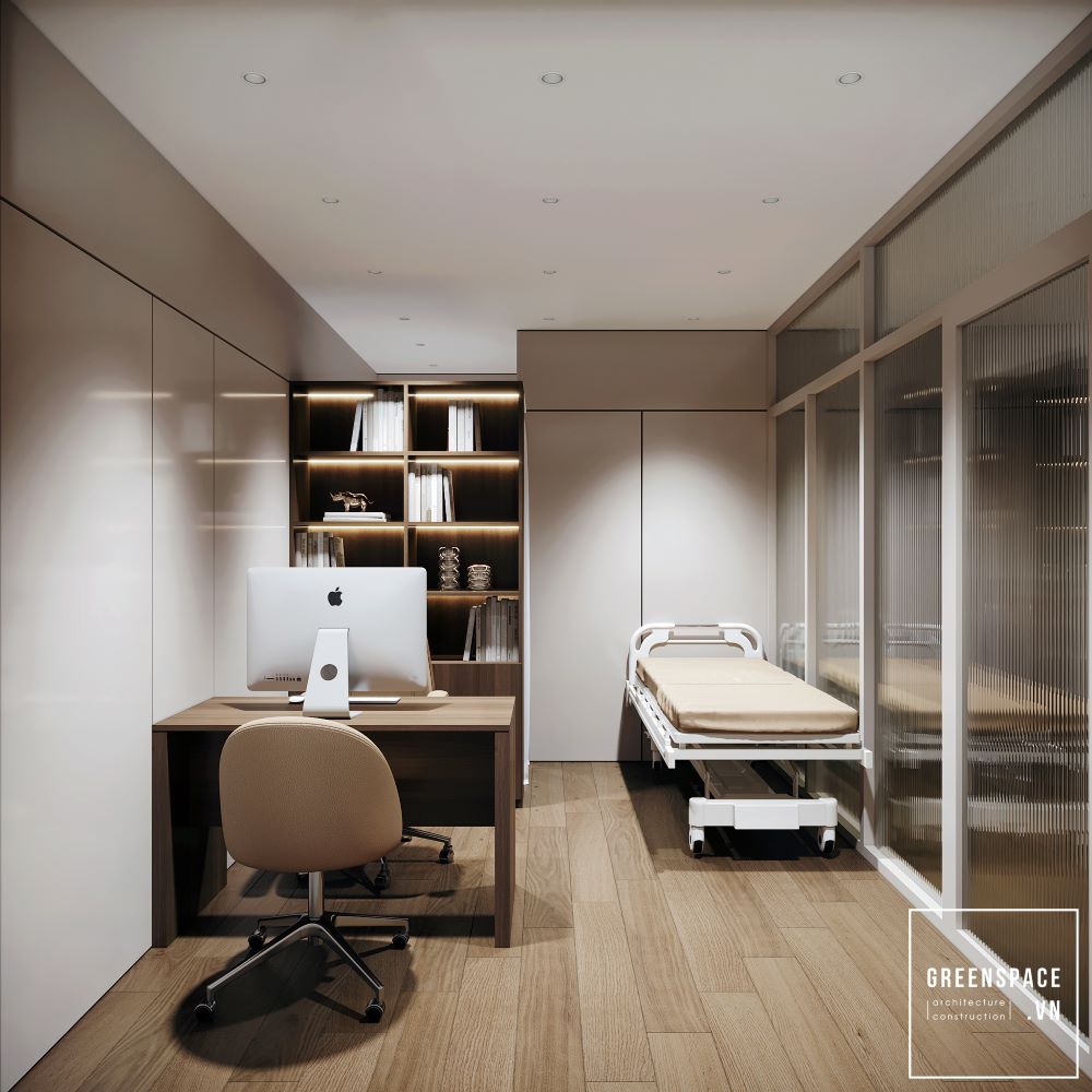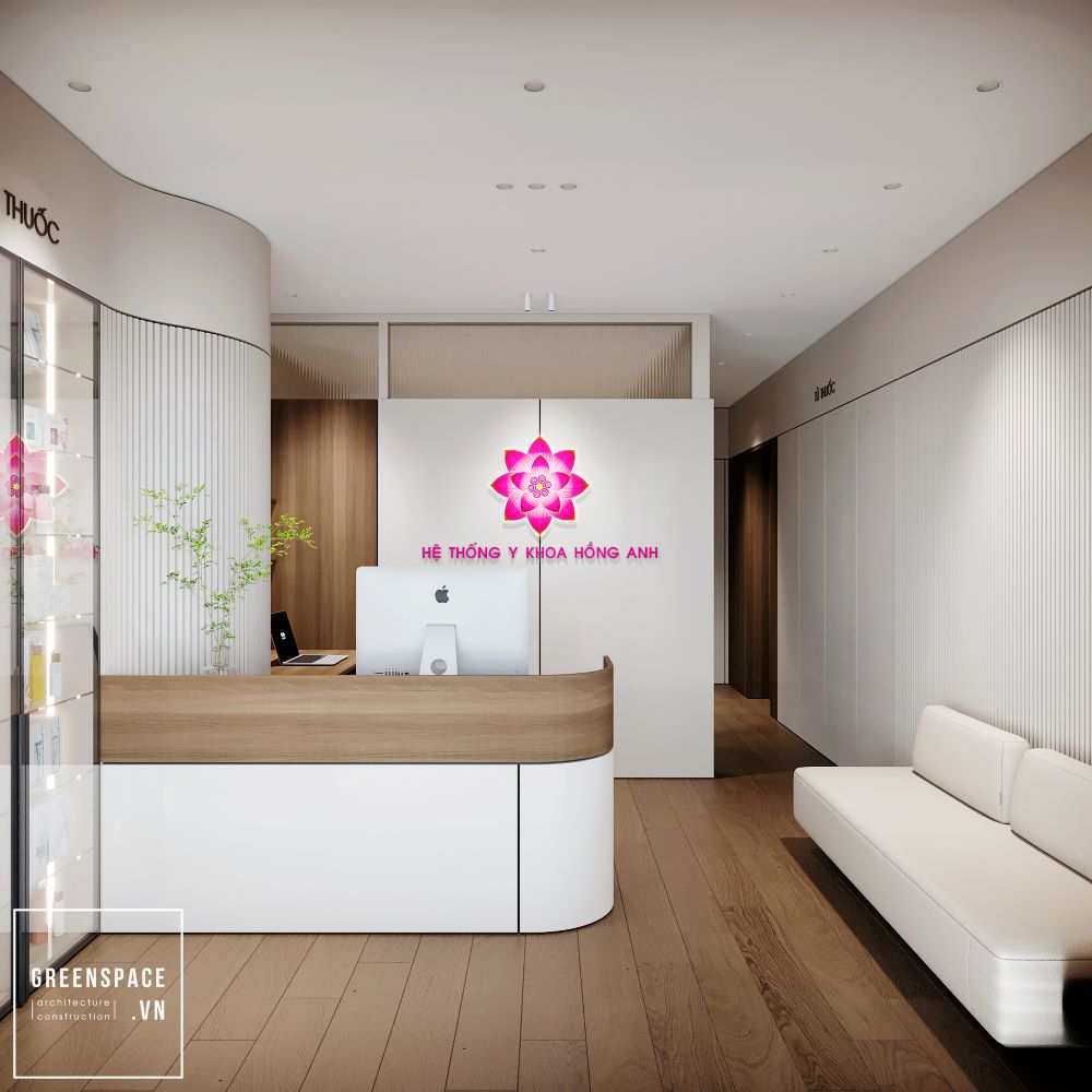 Phòng khám Hồng Anh mang phong cách hiện đại và tinh tế. Không gian được bố trí khoa học, rộng rãi và sáng sủa. Màu sắc chủ đạo là trắng kem kết hợp gỗ tự nhiên. Ánh sáng tự nhiên tràn ngập tạo cảm giác thư giãn. Khu vực lễ tân sang trọng với logo nổi bật. Phòng chờ thoáng đãng, ghế ngồi êm ái và gọn gàng. Khu khám bệnh được ngăn cách bằng kính mờ tinh tế. Nội thất gỗ kết hợp kim loại tạo vẻ chuyên nghiệp. Phòng làm việc của bác sĩ tối giản nhưng ấm cúng. Bàn ghế thiết kế công thái học giúp làm việc thoải mái. Phòng họp trang bị đầy đủ màn hình và bàn dài. Hành lang rộng, kết nối các khu chức năng mạch lạc. Từng chi tiết đều được chăm chút tỉ mỉ và hiện đại. Tổng thể thể hiện đẳng cấp của một phòng khám cao cấp.
