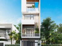 Nhà phố cao tầng nổi bật với lam gỗ. Mặt tiền chia nhịp tạo chiều sâu. Hệ kính rộng tăng sự thông thoáng. Ban công nhỏ thêm sắc xanh tự nhiên. Hình khối mảnh mai hợp khu dân cư. Tông màu ấm tạo cảm giác hài hòa. Tổng quan mang phong cách hiện đại nhẹ nhàng. Mẫu nhà phù hợp cho kinh doanh shophouse.