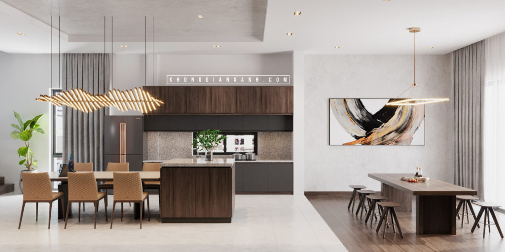 Khu bếp nổi bật với màu nâu gỗ cá tính bắt mắt trên nền trung tính tổng thể, hệ bàn ăn kết hợp đảo bếp là sự tận dụng không gian tối ưu cho nhiều mục đích sử dụng.