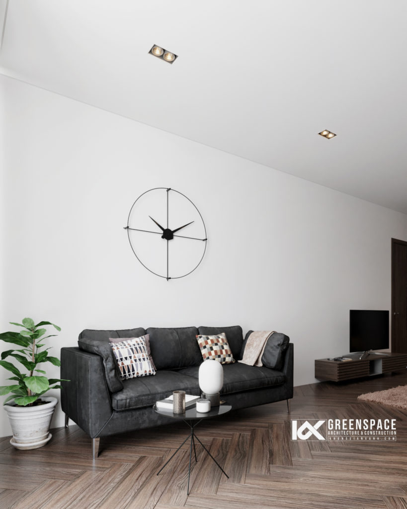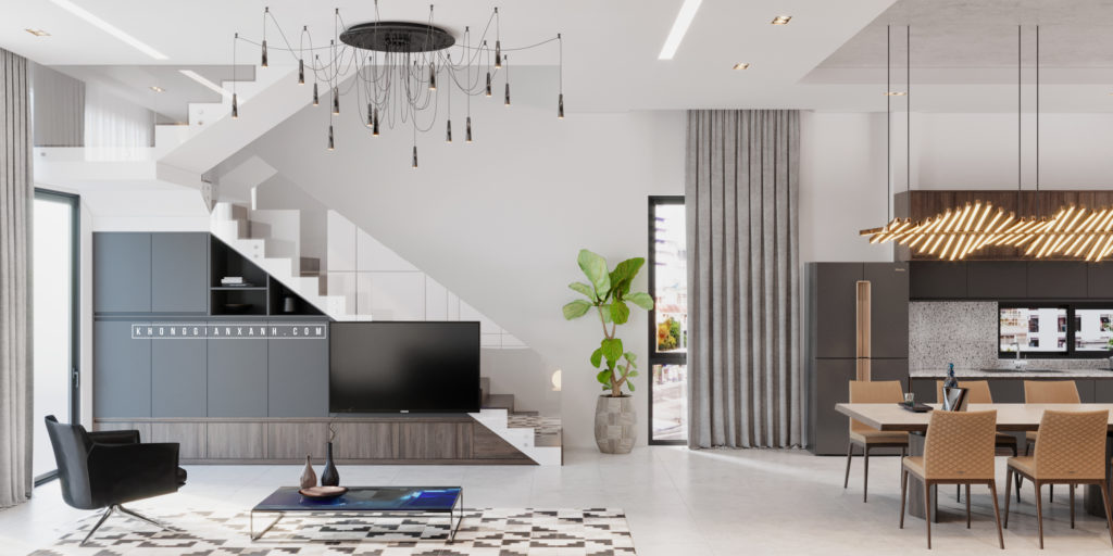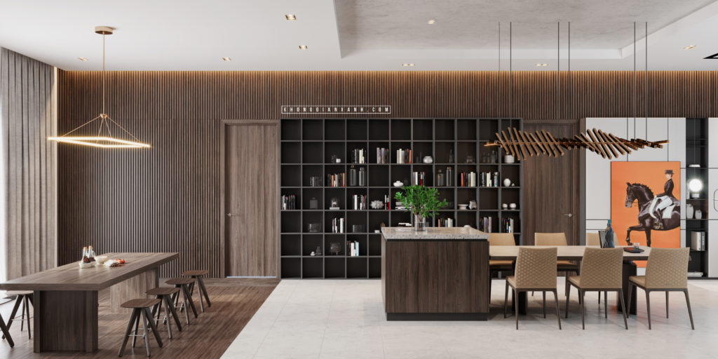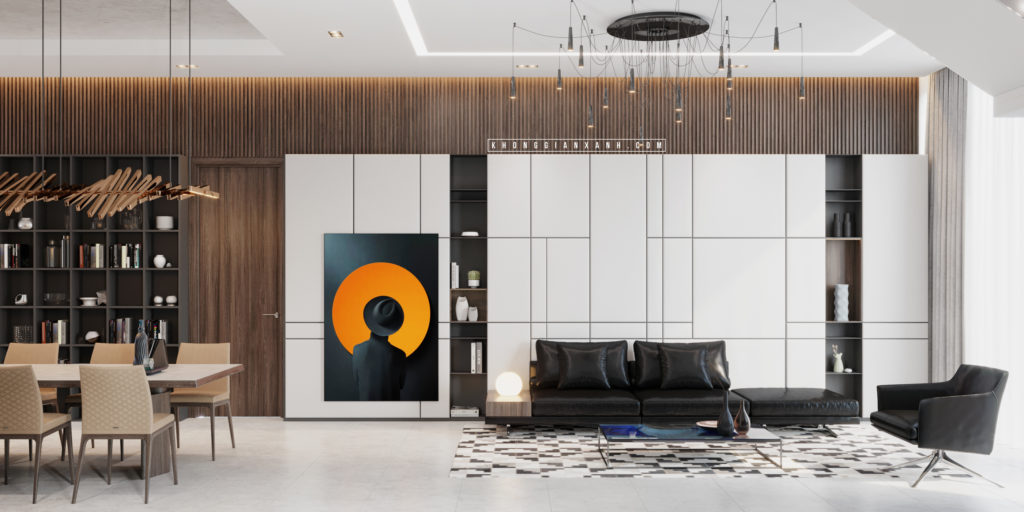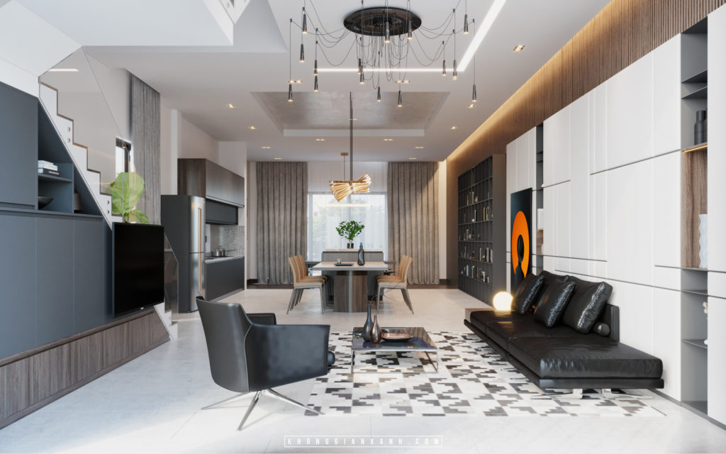 Sử dụng tone màu trung tính làm chủ đạo và lựa chọn tone trầm của màu gỗ óc chó với vai trò điểm nhấn chính trong không gian, bức vách trang trí sau sofa nổi bật lên với màu trắng tao nhã, phòng khách kết nối với phòng ăn tạo nên một không gian thoáng đãng rộng rãi.