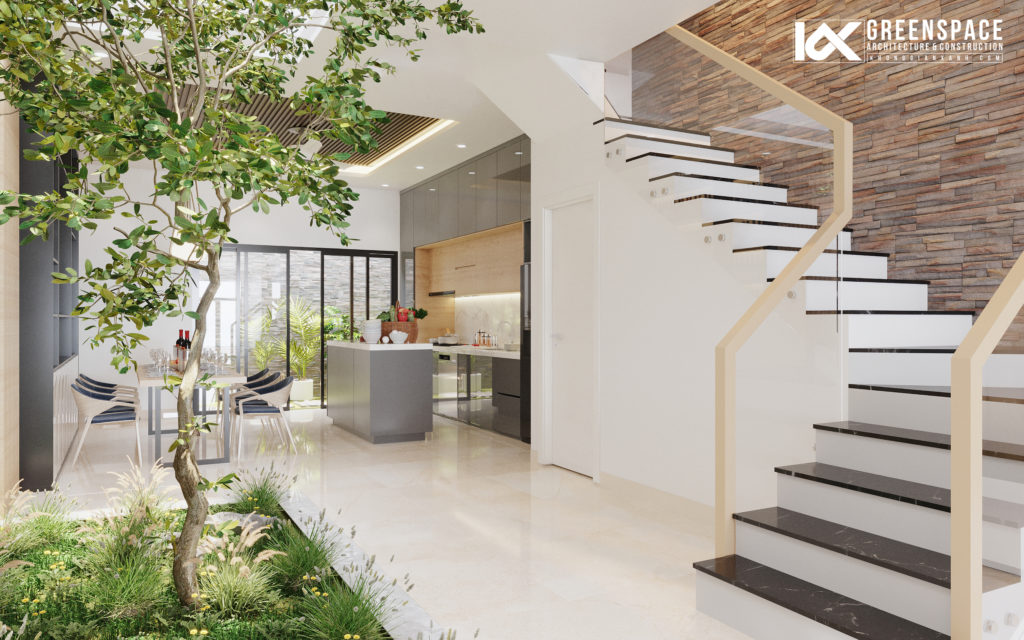 Các khoảng thông tầng được đưa vào thiết kế mặt bằng để xử lý vấn đề trên, tầng 1 không gian khách – bếp liên hoàn nối với nhau bằng một khoảng sân xanh mát có nắng gió tự nhiên. Các phòng ngủ được bố trí tối ưu với những diện thoáng lớn, lưu thông gió được tính toán để mang lại hiệu quả tối đa cho các không gian phòng.
