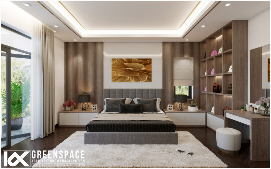 Phòng ngủ chính đi theo tone trầm xuyên suốt toàn nhà, rộng rãi với hệ cửa kính lớn view nhìn ra khu sân vườn. Phòng vệ sinh kết hợp khu thay đồ sang trọng trong tone màu sáng.