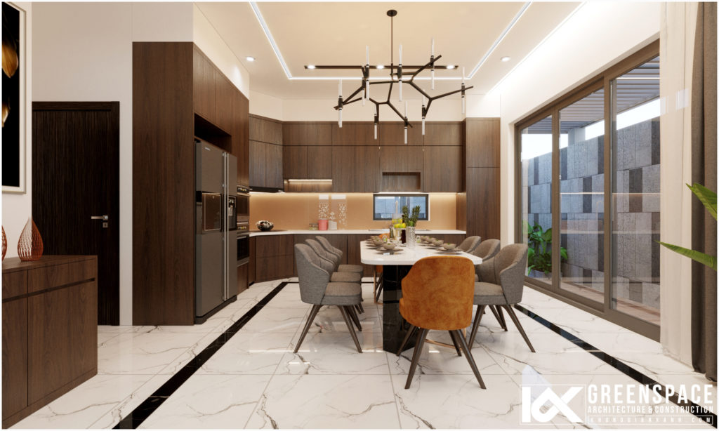 Phòng bếp – ăn ấm cúng với hệ tủ gỗ tối màu kết hợp ánh đèn vàng, bộ bàn ăn trẻ trung với mặt bàn đá trắng, ghế nỉ màu ghi sáng giúp cân bằng lại không gian, mang lại nét hiện đại nhã nhặn và gần gũi.