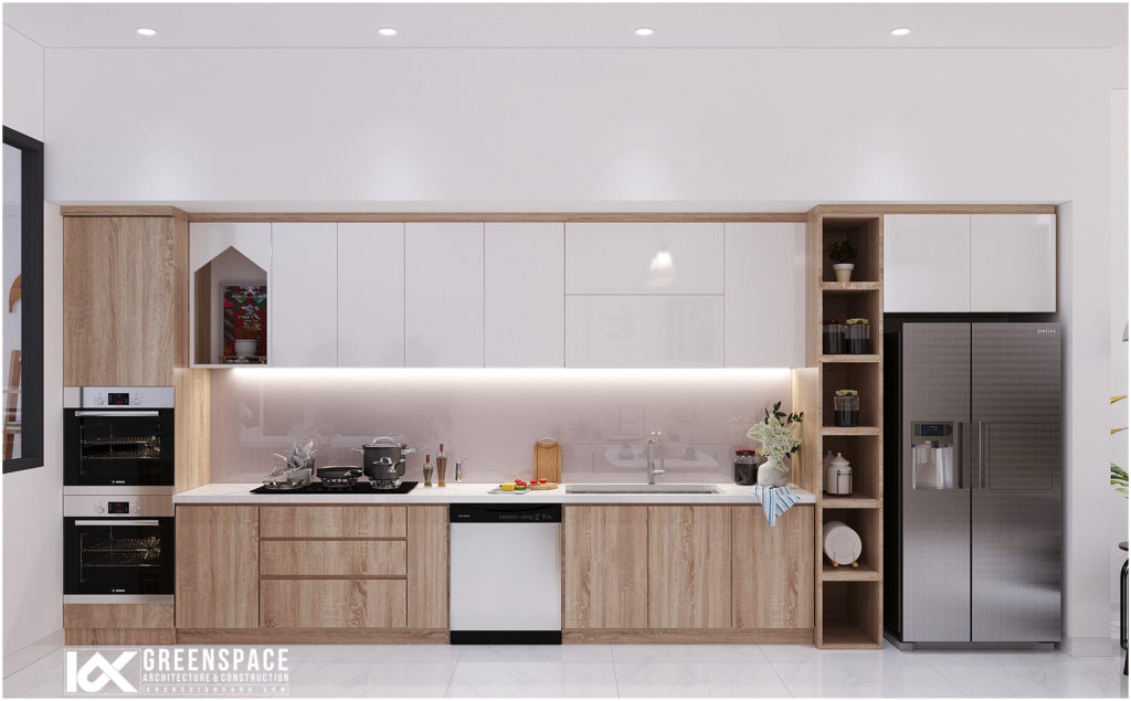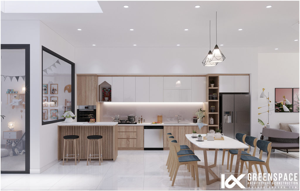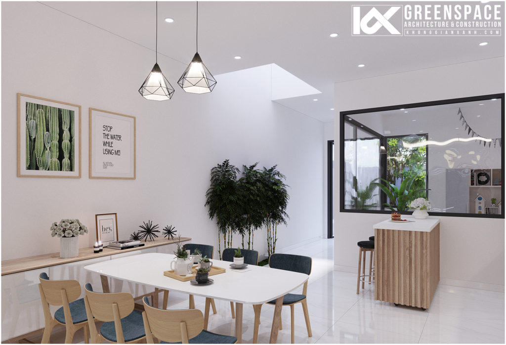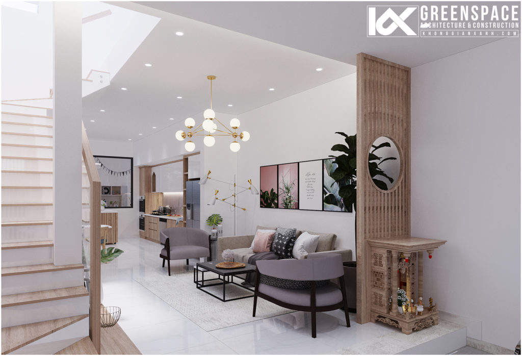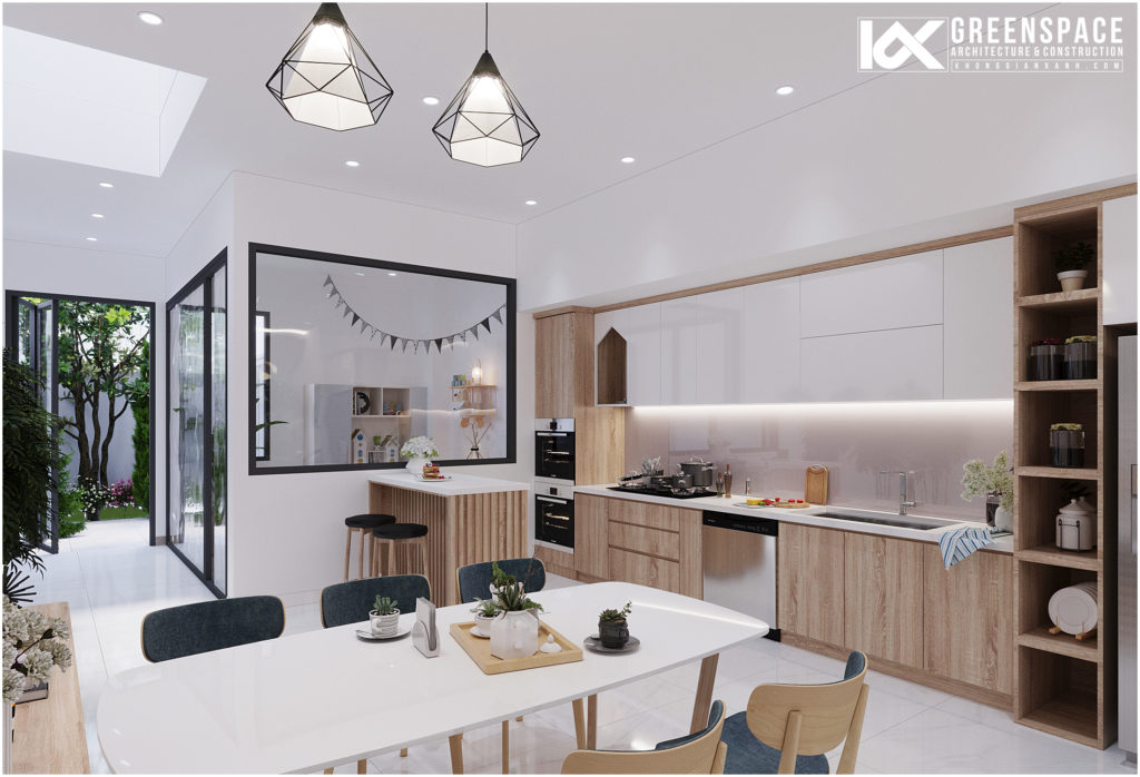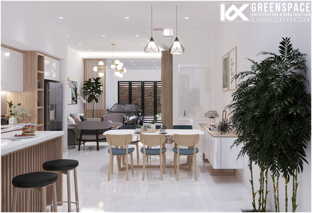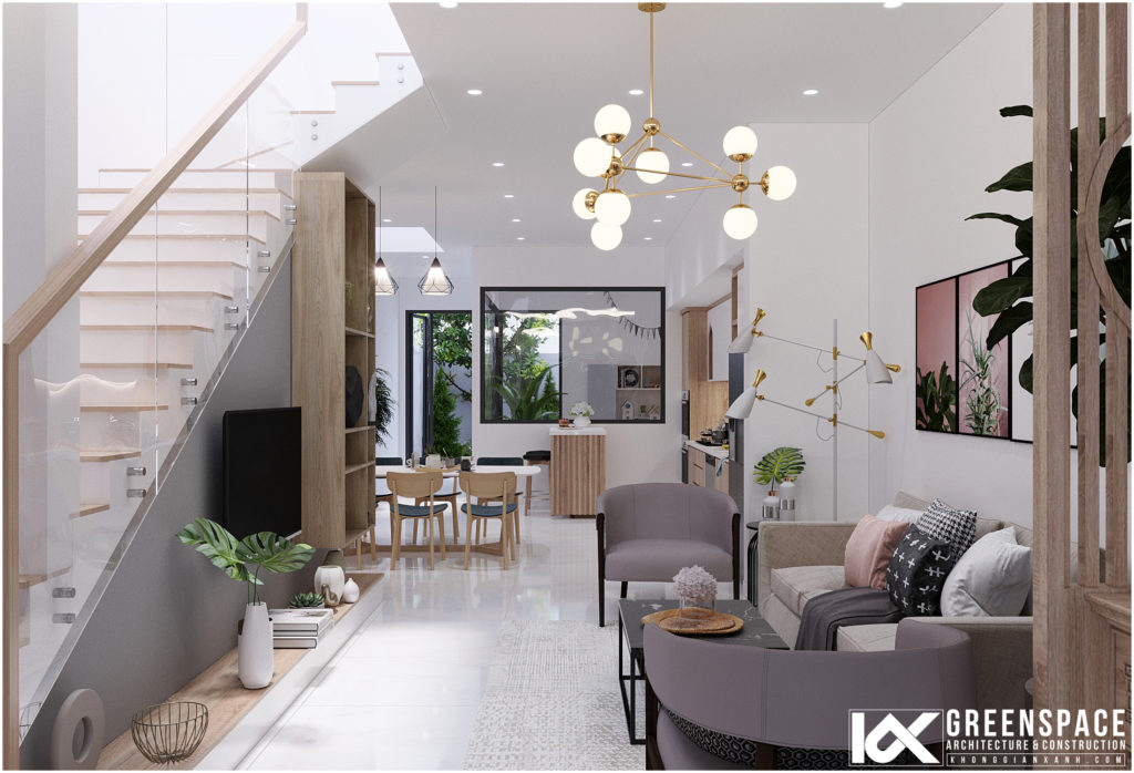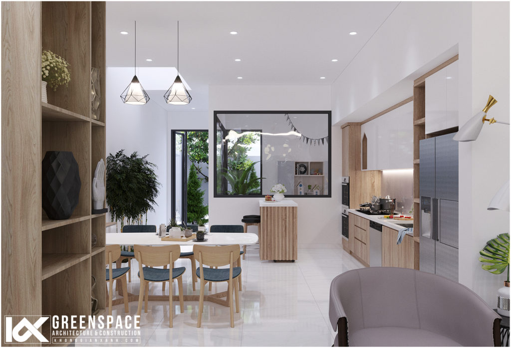 Để loại bỏ những bất cập của hiện trạng và các mặt hạn chế của dạng kiến trúc nhà phố, phương án cải tạo nội thất nhà phố đưa ra với phòng khách – bếp – ăn liên hoàn tone màu sáng kết hợp màu gỗ mộc mạc khiến không trở nên rộng rãi và xuyên suốt.