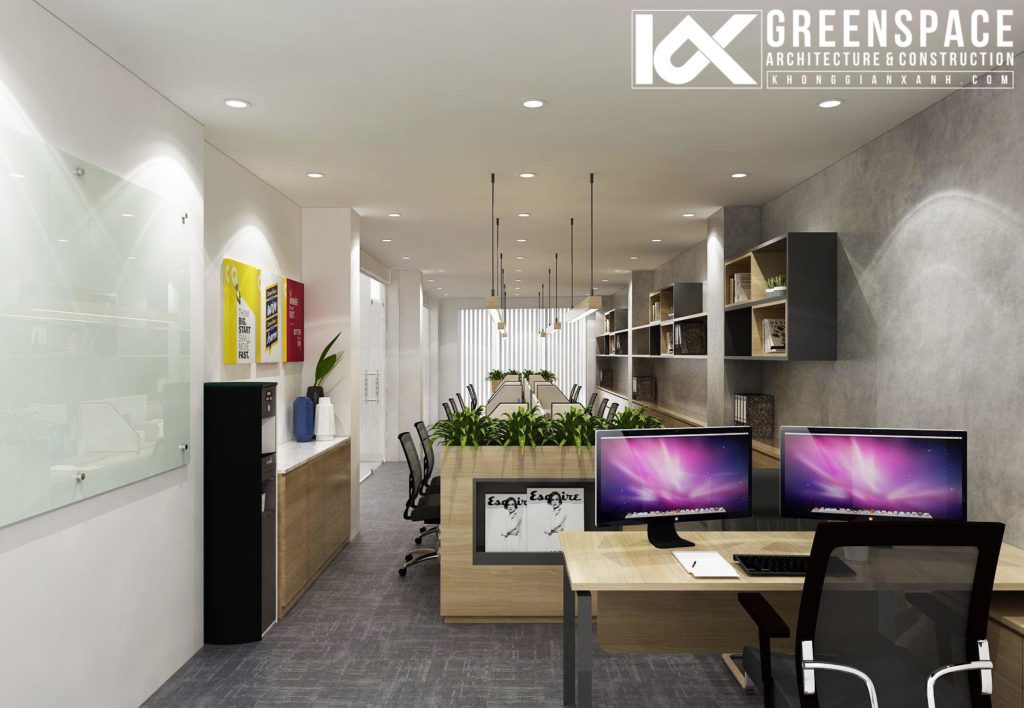 Sử dụng các mảng tường nhấn sơn giả bê tông để tạo nên nét phá cách cho dạng không gian văn phòng nhàm chán. Gỗ công nghiệp được dùng làm vật liệu chính xuyên suốt công trình bởi sự đa dạng bề mặt vân và tính tiện dụng…