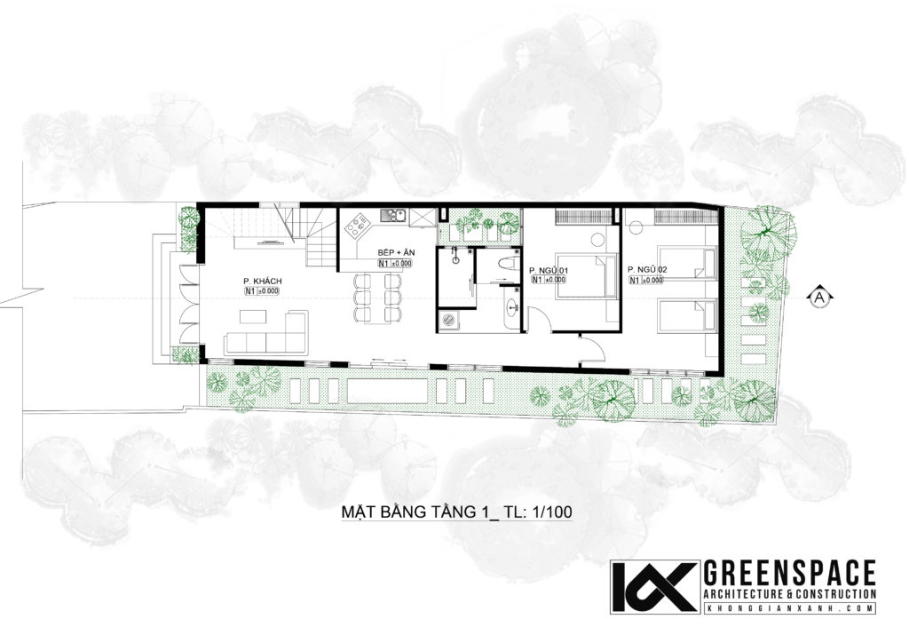 Khu đất với mặt tiền rộng 7m, một phần đất bên hông được tách thành khu vườn nhỏ nằm tăng diện thoáng cho ngôi nhà. Mặt bằng bố trí tầng 1 với công năng khách bếp – ăn, ưu tiên phòng ngủ cho 3 cụ để tiện việc di chuyển sinh hoạt. Không gian chung liên thông nhau và có những mảng cửa kính lớn mở ra vườn tận dụng nguồn năng lượng thiên nhiên một cách tối đa.