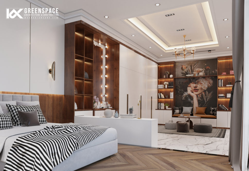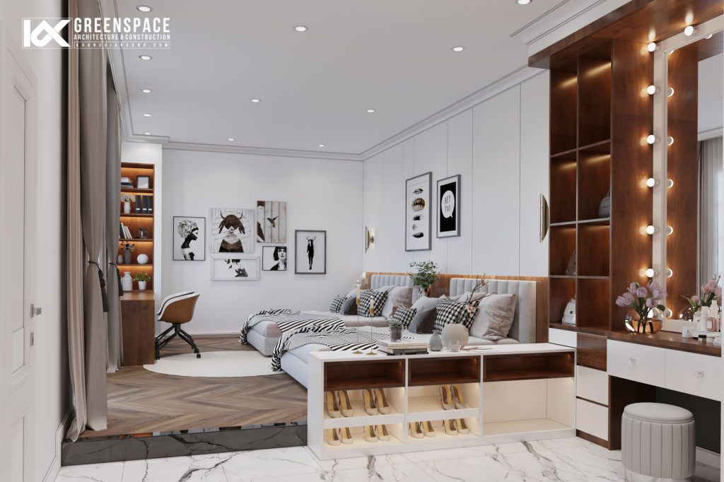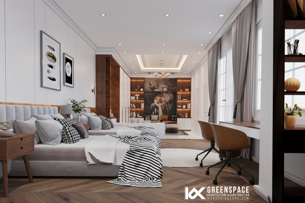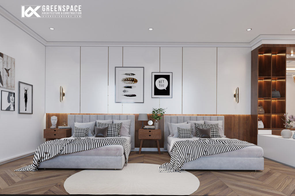 Phòng ngủ con được thiết kế theo hướng hiện đại trẻ trung hơn nhưng vẫn theo tone chung xuyên suốt toàn bộ công trình, bố trí 2 giường độc lập, có khu sofa thư giãn phù hợp đón tiếp bàn bè ghé chơi và checkin