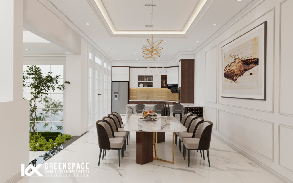 Phòng ăn rộng rãi có view cửa kính lớn nhìn ra vườn kết nối với khu bếp đầy đủ tiện nghi, màu gỗ óc chó trở thành điểm nhấn sáng giá trên nền tổng thể trung tính của không gian.