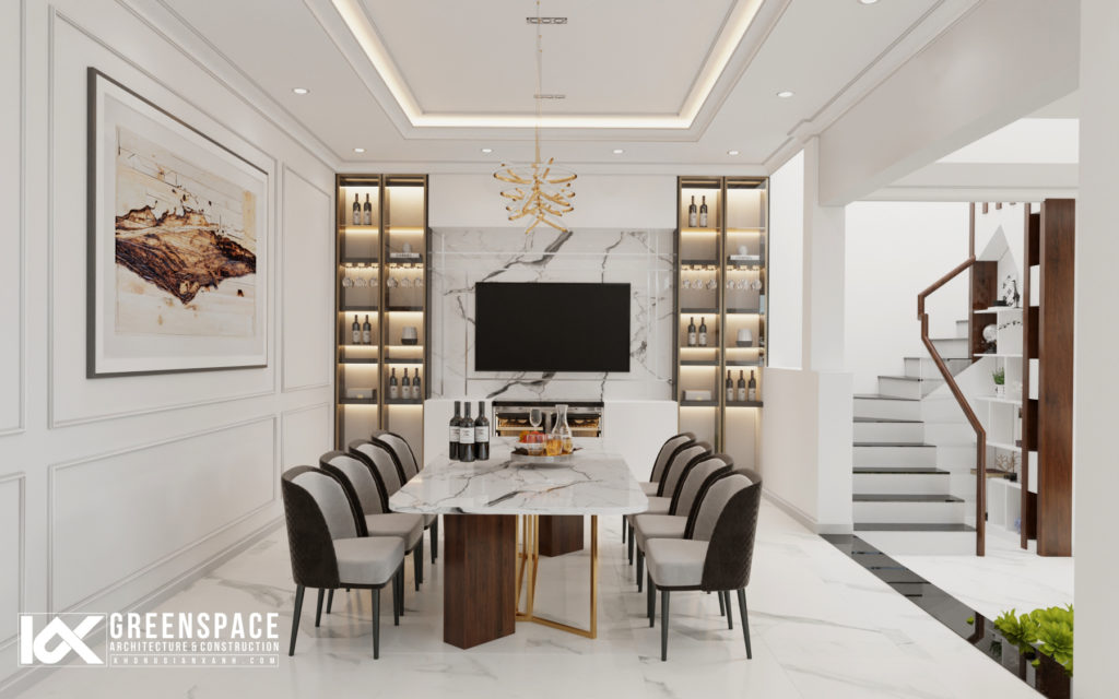Các chi tiết phào chỉ được cách điệu nhấn nhá mang lại vẻ đẹp sang trọng đặc trưng của phong cách tân cổ nhưng vẫn giữ được nét hiện đại nhẹ nhàng phù hợp với quy mô nhà phố.