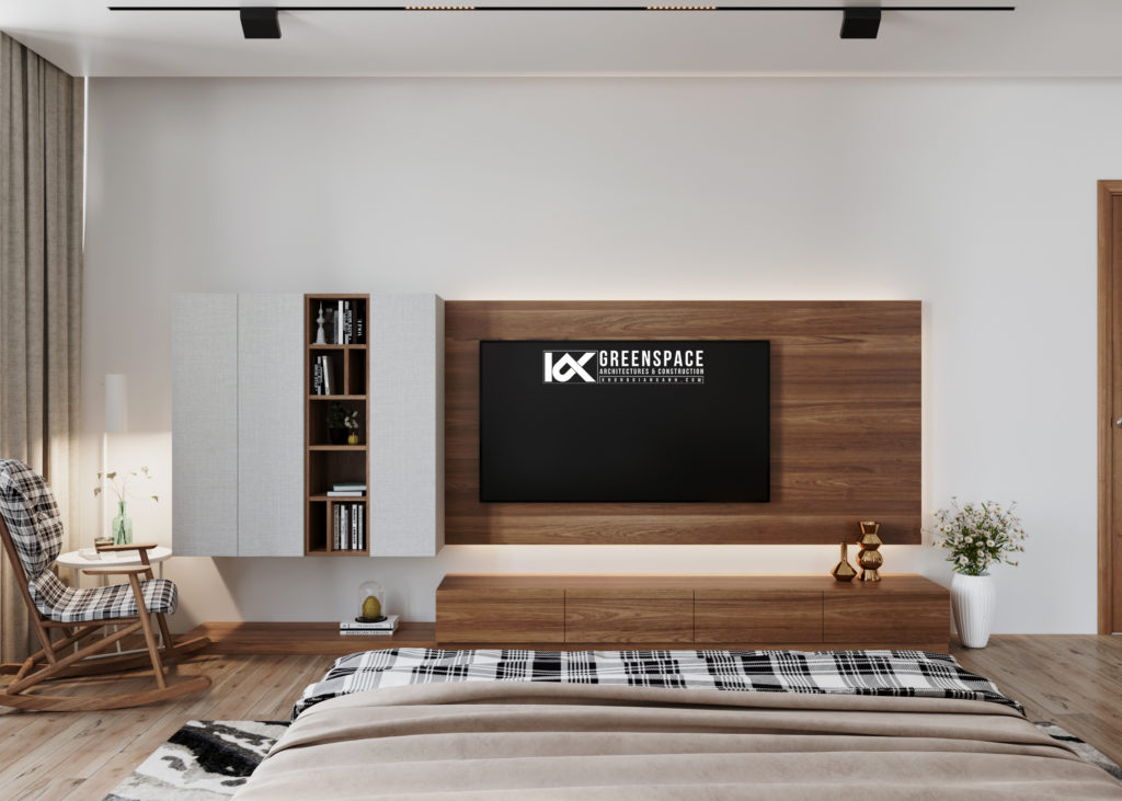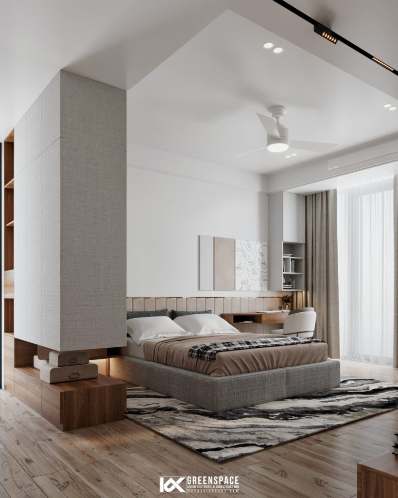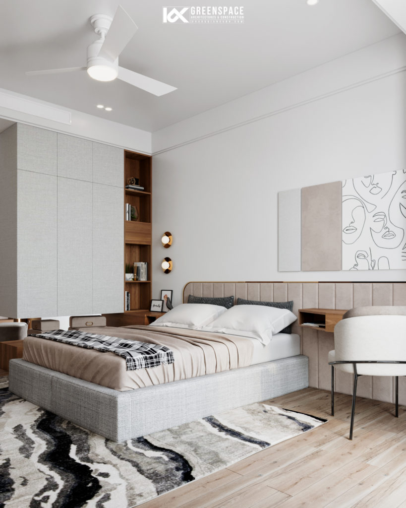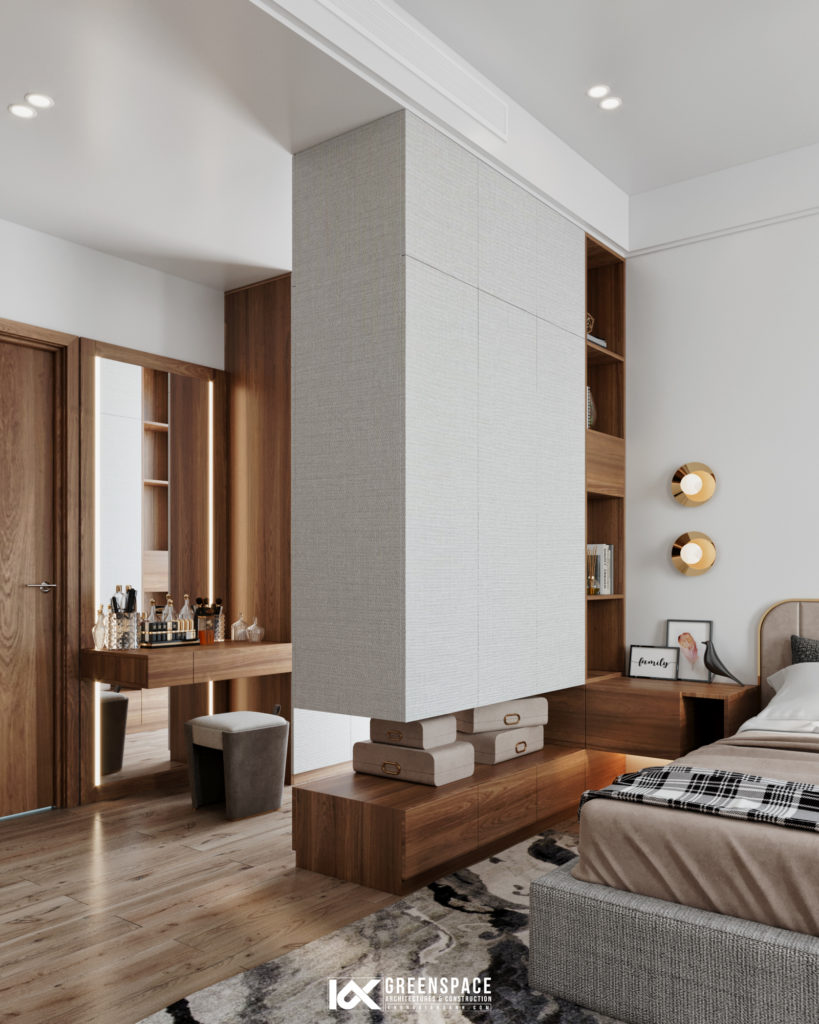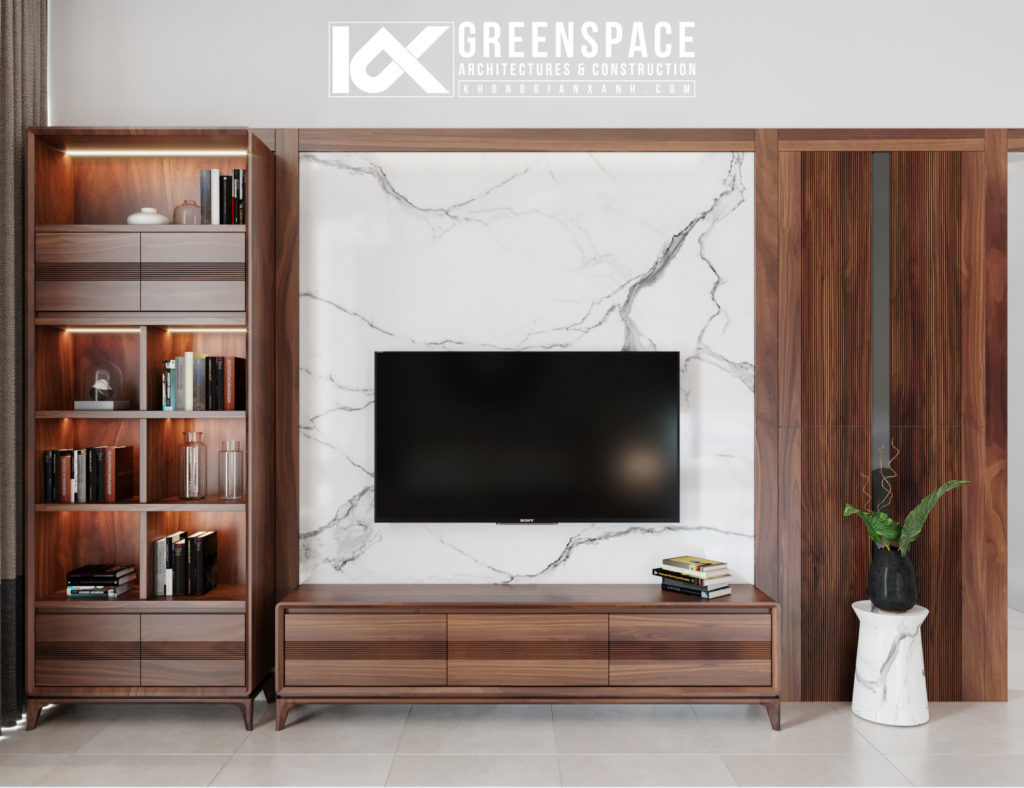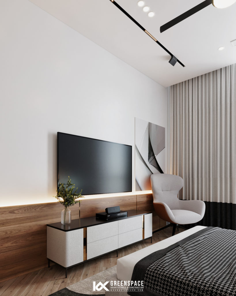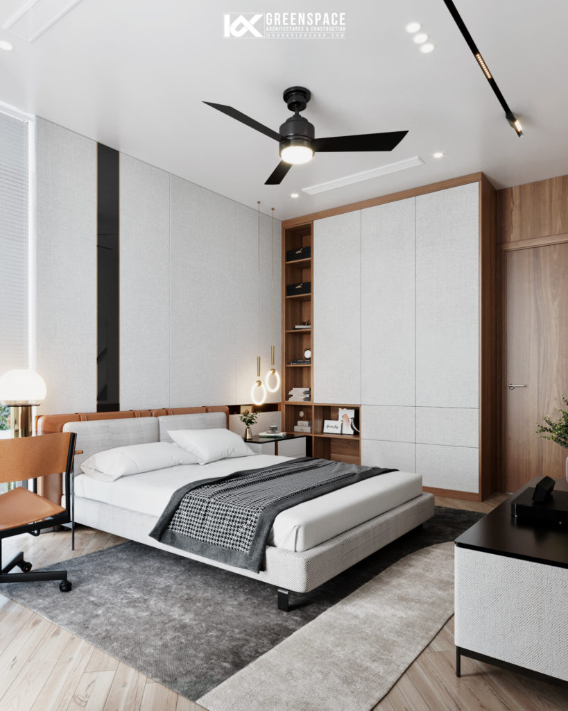 Tổng thể công trình sử dụng gam màu trắng – xám, gỗ óc chó được đưa vào làm điểm nhấn cân bằng lại không gian. Màu gỗ trầm ấm nổi bật trên không gian làm rõ lên nét đẹp sang trọng của công trình.