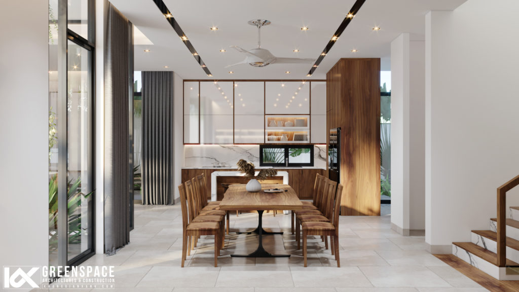 Xuyên suốt công trình là vật liệu gỗ óc chó tự nhiên kết hợp cùng các màu gỗ công nghiệp khác để tránh làm nặng nề không gian. Bộ bàn ăn gỗ óc chó tự nhiên nổi bật được cân bằng lại bằng hệ tủ bếp gỗ công nghiệp cánh phẳng màu trắng khiến không gian sang trọng vẫn giữ được nét nhẹ nhàng thoáng đãng hòa quyện cùng cảnh vườn xung quanh.